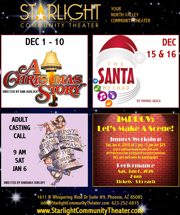 Peter Pan Desert Stages Theatre Website: http://www.desertstages.org/ Location: Fashion Square, 7014 East Camelback Road, Suite 0586, Scottsdale, AZ Box Office: 480.483.1664 Dates: 11/17/2017 to 12/23/2017 A Winnie-the-Pooh Christmas Tail Valley Youth Theatre Website: http://www.vyt.com/ Location: 525 North First Street, Phoenix, AZ Box Office: (602) 253 - 8188 Dates: 12/1/2017 to 12/23/2017 Junie B. in Jingle Bells, Batman Smells Fountain Hills Youth Theater Website: http://www.fhtaz.org/ Location: 11445 N. Saguaro Blvd., Fountain Hills, AZ Box Office: (480) 837-9661 x3 Dates: 12/1/2017 to 12/17/2017 A Christmas Story: The Musical Actor's Youth Theatre Website: https://www.actorsyouththeatre.org/ Location: The Tuscany Theatre, 861 N Higley Road, suite 105, Gilbert, AZ Box Office: 480-907-7050 Dates: 12/7/2017 to 12/23/2017 Elf Jr. Greasepaint Youtheatre Website: http://www.greasepaint.org/ Location: 7020 E. 2nd Street, Scottsdale, AZ Dates: 12/8/2017 to 12/17/2017 Elf, Jr Limelight Performing Arts Website: http://limelightyouththeater.org/ Location: 511 W Guadalupe Rd Suite 12, Gilbert, AZ Box Office: 480-926-1124 Dates: 12/8/2017 to 12/17/2017 Into the Woods Canyon Crest Academy Website: http://www.cca-envision.org/ Location: 5951 Village Center Loop Rd, San Diego, CA Dates: 12/8/2017 to 12/16/2017 You're A Good Man, Charlie Brown Mountain View High School Website: http://www.torodrama.com/ Location: 2700 E. Brown Road, Mesa, AZ Box Office: (480) 472-7157 Dates: 12/13/2017 to 12/16/2017 Days/Times: Wednesday, 12/13 - Friday, 12/15 @ 7pm, Saturday 12/16 @ 2pm The Magic Treehouse: Pirates Past Noon kids San Diego Junior Theatre Website: https://juniortheatre.com/ Location: 1800 El Prado, San Diego, CA Box Office: 619-239-8355 Dates: 1/5/2018 to 1/21/2018 Days/Times: Fridays @ 7pm, Saturdays & Sundays @ 2pm Les Miserables J*Company Website: http://www.sdcjc.org/jc/ Location: 4126 Executive Drive, La Jolla, CA Box Office: 858.362.1348 Dates: 1/12/2018 to 1/28/2018 The Lion, The Witch and The Wardrobe Theater Works Website: http://theaterworks.org/ Location: 10580 N. 83rd Drive, Peoria, AZ Box Office: 623-815-7930 Dates: 1/12/2018 to 1/28/2018 House of Blue Leaves Chaparral High School Location: 27215 Nicolas Road, Temecula, CA Box Office: 951-694-4200 ext. 144 Dates: 1/18/2018 to 1/20/2018 Days/Times: 1/18 & 1/19 @ 7pm; 1/20 @ 2pm & 7pm Disney’s The Lion King, Jr. Limelight Performing Arts Website: http://limelightyouththeater.org/ Location: Mesa Arts Center, Mesa, AZ Box Office: 480-926-1124 Dates: 1/24/2018 to 1/28/2018 Add a calendar listing |